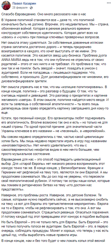 "Мы совсем недавно определились с тем, частью какой цивилизации хотим быть. Мы лишь недавно перестали играть в игру под названием "многовекторность". Нет ничего удивительного, что мы с самоотверженностью неофитов видим в нем нечто большее, чем просто музыкальное состязание".