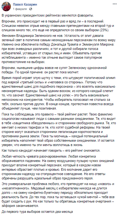 Другой темой Казарина стала адвокатура украинской власти времен Петра Порошенко. По крайней мере, на президентских выборах Павел давал понять, что поддерживает скорее старого президента. А Зеленского называл "персонажем".