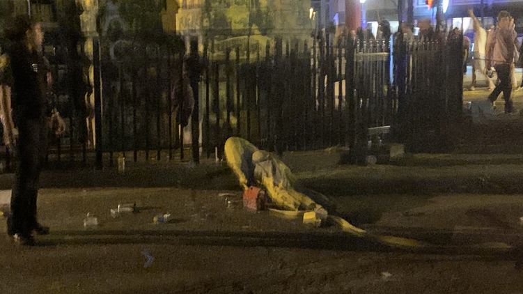Так, судя по видео, протестующие обтянули статую веревкой, за которую ее тянули вниз. Она упала с постамента на стоящих внизу людей. 45-летний Грин получил черепно-мозговую травму, врачи с трудом смогли добраться к нему для госпитализации из-за толпы протестующих. В результате травмы демонстрант впал в кому.