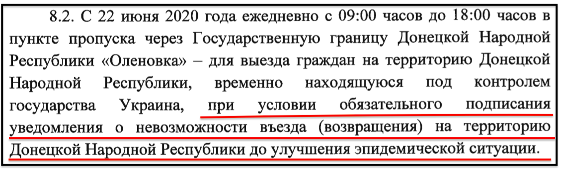 Важно: при выезде из "ДНР" гражданин будет подписывать бумагу о невозможности вернуться до улучшения эпидситуации, это следует из "указа" Дениса Пушилина. Но все же некоторые вернуться смогут. Как - расскажем в следующем блоке.