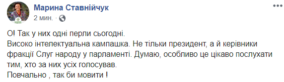 "Высокоинтеллектуальная компашка. Не только президент, но и руководители фракции Слуги народа в парламенте", - оценила разговор двух мужчин бывший пресс-секретарь президента Ющенко Марина Ставнийчук.