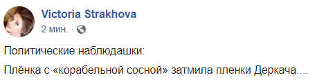 "Плёнка с "корабельной сосной" затмила пленки Деркача", - пишет финансист Виктория Страхова.