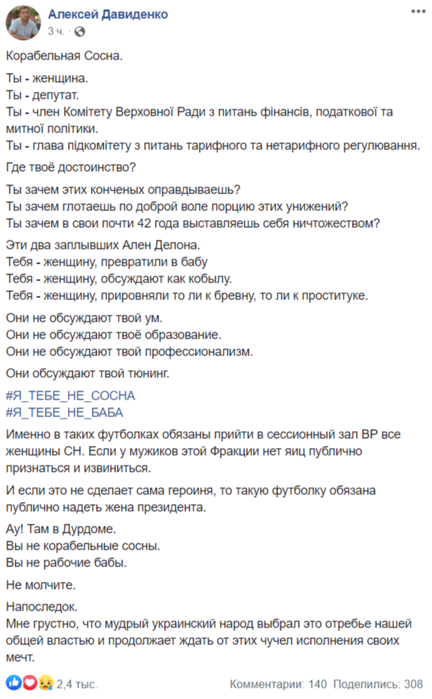 "Корниенко, Арахамия и Аллахвердиева. Даже не знаю, что противнее: сексизм двух боровов или идиотизм "бабы", оправдывающий его. Слуги либидо и пищевода", - прокомментировала она.
