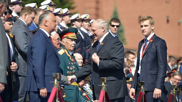 Видео снималось с трибуны, когда Лукашенко шел вдоль нее после завершения мероприятия. Один из гостей поблагодарил иностранных лидеров за то, что они приехали в Москву.