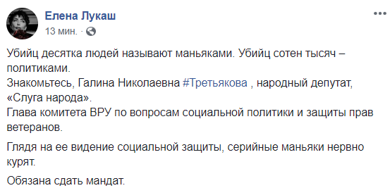 "Убийц десятка людей называют маньяками. Убийц сотен тысяч – политиками. Знакомьтесь, Галина Николаевна #Третьякова , народный депутат, "Слуга народа".
