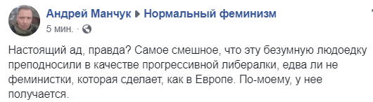 "Настоящий ад, правда? Самое смешное, что эту безумную людоедку преподносили в качестве прогрессивной либералки, едва ли не феминистки, которая сделает, как в Европе. По-моему, у нее получается", - считает журналист Андрей Манчук.