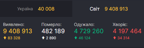 Данные на 25 июня. Число зараженных Covid-19 в Украине выросло до 40 008 человек, прирост за сутки - 994