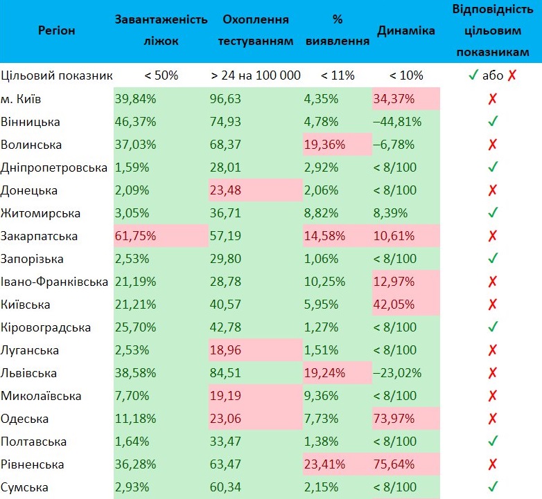 На сегодня к дальнейшему ослаблению карантина не готовы: Киев, Киевская, Волынская, Закарпатская, Житомирская, Донецкая, Ивано-Франковская, Луганская, Львовская, Николаевская, Одесская, Ровенская, Тернопольская и Черновицкая области. За последние сутки список покинула Днепропетровская, а до этого - Житомирская области, так как ситуация в регионах улучшилась.