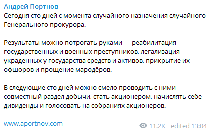 "Результаты можно потрогать руками — реабилитация государственных и военных преступников, легализация украденных у государства средств и активов, прикрытие их офшоров и прощение мародёров. В следующие сто дней можно смело проводить с ними совместный раздел добычи, стать акционером, начислять себе дивиденды и голосовать на собраниях акционеров", - написал Портнов в своем телеграм-канале.