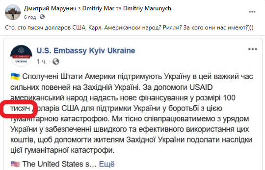 В сети неоднозначно отнеслись к размеру финансовой помощи США Украине в размере 100 тысяч долларов на ликвидацию последствий масштабных наводнений в западных регионах страны.