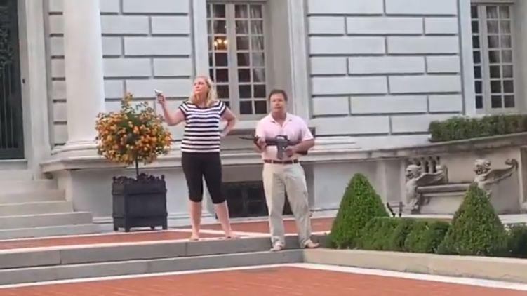 Как видно на записи, женщина с пистолетом и мужчина с автоматом стоят около входа в свой дом. При этом женщина направляет пистолет на демонстрантов, идущих мимо их дома.