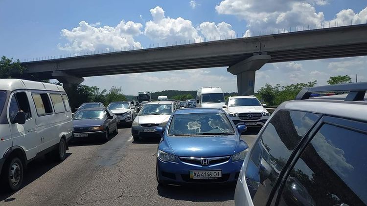 Как видно на фотографиях, вдоль дороги тянется большая очередь из автомобилей, преимущественно с киевскими номерами.