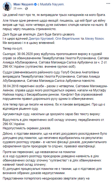 "Сегодня, 30.06.2020 года состоялось провозглашение приговора в судебном деле по обвинению Темербулатова Умолта Руслановича, Саитова Ахмеда Абубакаровича, Саитова Магомеда-Салиха Арбуевича по ч. 2 ст. 296 УК Украины (хулиганство. Совершенное группой лиц).