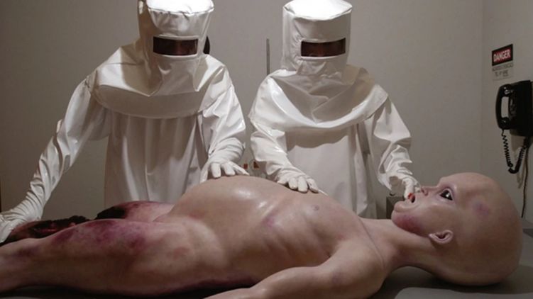 На черно-белых кадрах два человека в белых скафандрах исследуют лежащее на столе тело инопланетянина - человекообразного гуманоида невысокого роста и хрупкого телосложения. У него большие темные глаза, отсутствуют нос, уши, волосы, на руках и ногах по 6 пальцев. Рядом с двумя патологоанатомами в белых скафандрах стоит человек в темном плаще с военной выправкой.