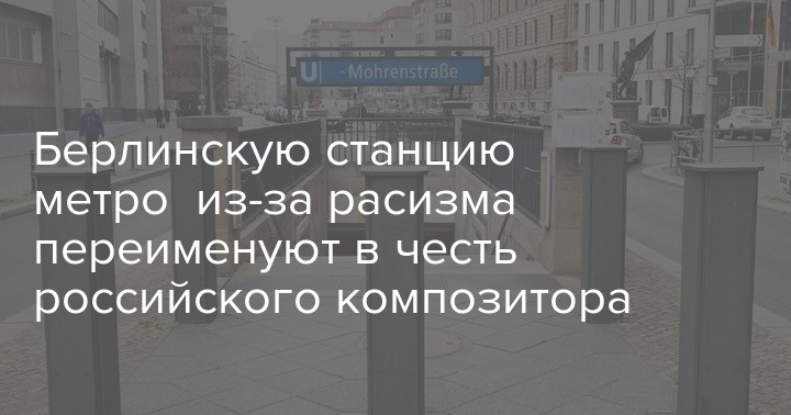 Берлинская транспортная компания BVG хочет переименовать одну их станций столичного метрополитена, которая вызывает споры из-за расизма. Станция "Моренштрассе" (Mohrenstraße) может стать "Глинкаштрассе" (Glinkastraße — "улица Глинки") в честь российского композитора Михаила Глинки, который умер в Берлине.