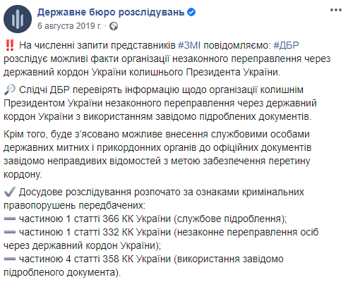 Следствие считает, что пограничник "дал незаконное указание подчиненным... на незаконный пропуск через государственную границу Украины пятого президента Украины, членов его семьи и других лиц для организации отдыха вне существующего пункта пропуска".
