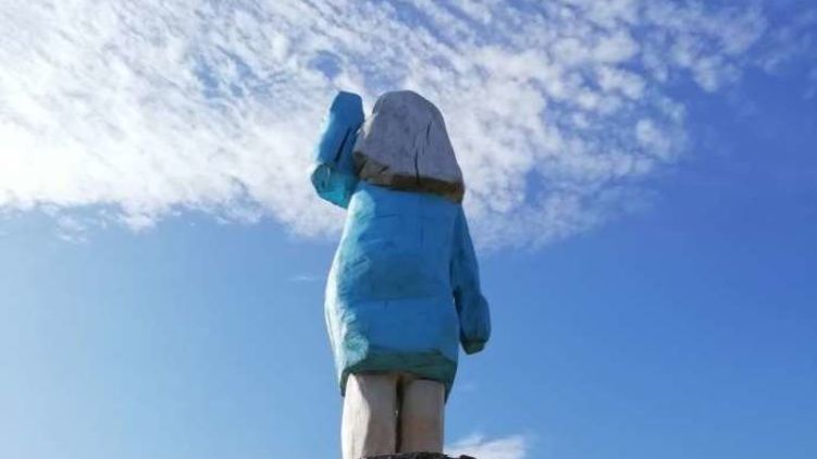 Деревянная скульптура Мелании Трамп располагалась в районе ее родного города Севница. Автором статуи из липы выступил местный художник Алеш Жупевц. Трамп была изображена в полный рост в голубом платье.