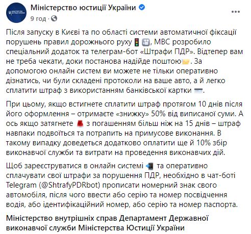 После запуска в Киеве и по области системы автоматической фиксации нарушений правил дорожного движения, МВД разработало специальное приложение и телеграмм-бот "Штрафы ПДД". Об этом сообщил Минюст на своей странице в Facebook.