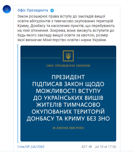 "Закон расширяет права поступления в учреждения высшего образования абитуриентов с временно оккупированных территорий Крыма, Донбасса и населенных пунктов, находящихся на линии соприкосновения. В частности, они смогут поступить в любое заведение высшего образования по квоте, размер которой определяет Министерство образования и науки Украины", - говорится в сообщении.