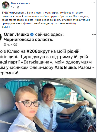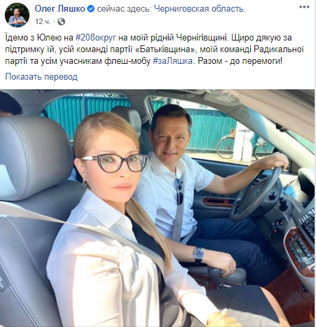 "Едем с Юлей на 208 округ на моей родной Черниговщине. Спасибо за поддержку ей, всей команде партии "Батькивщина", моей команде Радикальной партии и всем участникам флеш-моба #заЛяшка. Вместе - к победе!" - подписал Ляшко снимок.