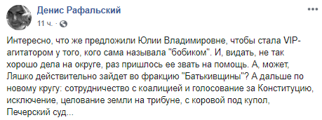 "Интересно, что же предложили Юлии Владимировне, чтобы стала VIP-агитатором у того, кого сама называла "бобиком". И, видать, не так хорошо дела на округе, раз пришлось ее звать на помощь. А, может, Ляшко действительно зайдет во фракцию "Батькивщины"? А дальше по новому кругу: сотрудничество с коалицией и голосование за Конституцию, исключение, целование земли на трибуне, с коровой под купол, Печерский суд..." - отреагировал на фото журналист Денис Рафальский.