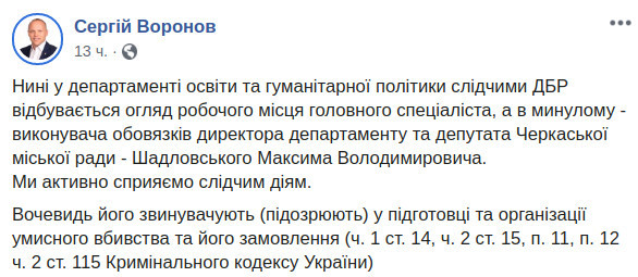 Директор департамента образования и гуманитарной политики Черкасского горсовета Сергей Воронов у себя в Фейсбуке сообщил, что вчера в департаменте прошел обыск у работавшего там по совместительству депутата Максима Шадловского.