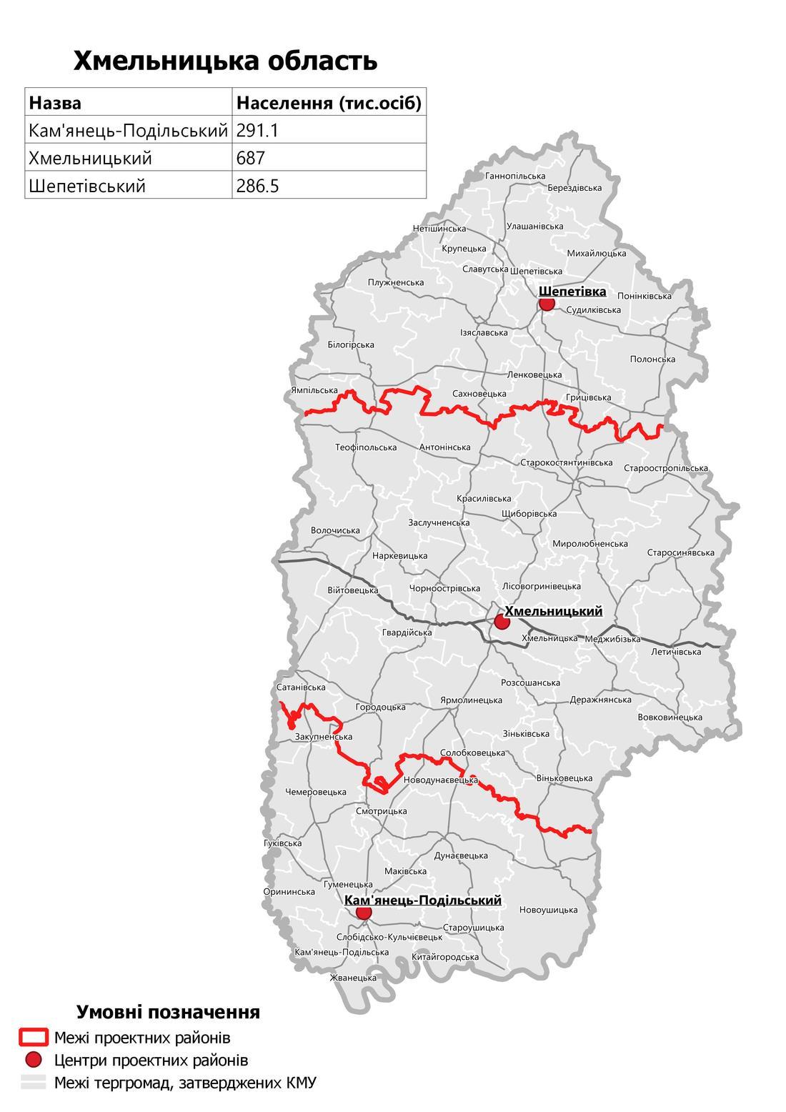 Хмельницкий район (с административным центром в городе Хмельницкий) в составе территорий Антонинской поселковой, Войтовецкоий поселковой, Виньковецкой поселковой, Вовковинецкой поселковой, Волочиской городской, Городецкой городской, Гвардейской сельской, Деражнянской городской, Заслучненскои сельской, Зиньковской сельской, Красиловской городской, Летичевской поселковой, Лисовогринивецькои сельской, Меджибожской поселковой, Миролюбненскои сельской, Наркевичской поселковой, Россошанской сельской, Сатановской поселковой, Солобковецькои сельской, Староконстантиновской городской, Староостропильскои сельской, Старосинявской поселковой, Теофипольской поселковой, Хмельницкой городской, Черноостровской поселковой, Щиборивскои сельской, Ярмолинецкой поселковой территориальных общин;