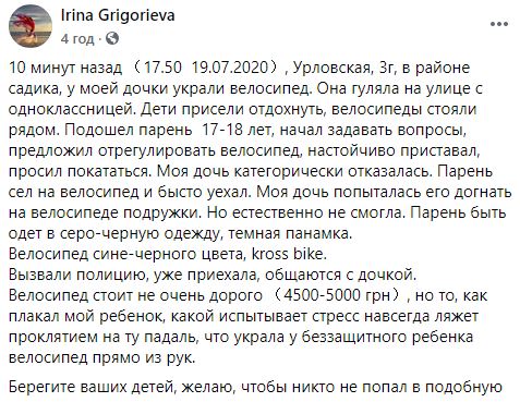 "10 минут назад (17:50 19.07.2020), Урловская, 3г, в районе садика, у моей дочки украли велосипед. Она гуляла на улице с одноклассницей. Дети присели отдохнуть, велосипеды стояли рядом. Подошел парень 17-18 лет, начал задавать вопросы, предложил отрегулировать велосипед, настойчиво приставал, просил покататься. Моя дочь категорически отказалась. Парень сел на велосипед и быстро уехал. Моя дочь попыталась его догнать на велосипеде подружки. Но естественно не смогла. Парень быть одет в серо-черную одежду, темная панамка", - рассказывает мать девочки.