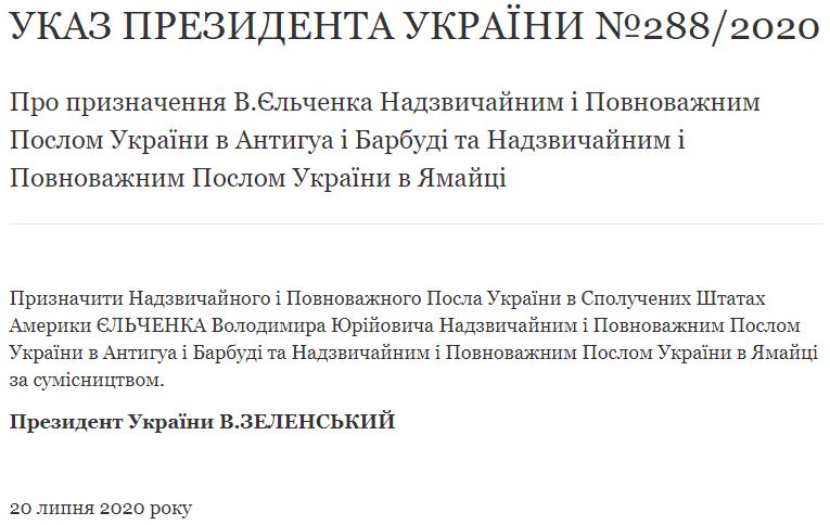 "Назначить Чрезвычайного и Полномочного посла Украины в США Ельченко Чрезвычайным и Полномочным послом Украины в Антигуа и Барбуда и Чрезвычайным и Полномочным послом Украины в Ямайке по совместительству", – сказано в тексте указа.