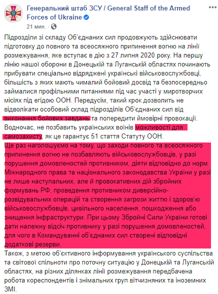 В заявлении же Генштаба Украины говорится, что ВСУ смогут вести ответный огонь, руководствуясь не приказами, а напрямую международными конвенциями и даже уставом ООН, которые гарантируют право на самозащиту.