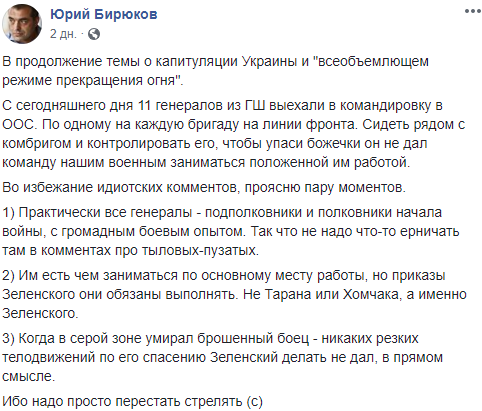 "11 генералов из ГШ выехали в командировку в ООС. По одному на каждую бригаду на линии фронта. Сидеть рядом с комбригом и контролировать его, чтобы, упаси божечки, он не дал команду нашим военным заниматься положенной им работой".