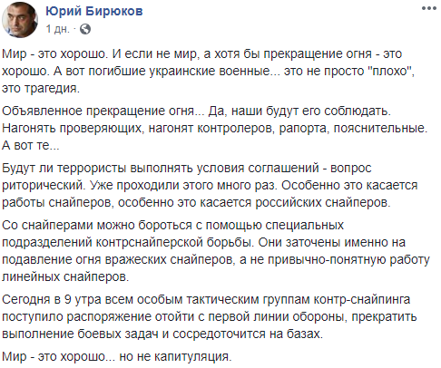 "Мир - это хорошо... но не капитуляция", - пишет в одном из постов бывший советник Порошенко Юрий Бирюков. Он также перечисляет признаки "зрады", которая происходит, по его данным, в связи в предстоящим перемирием.