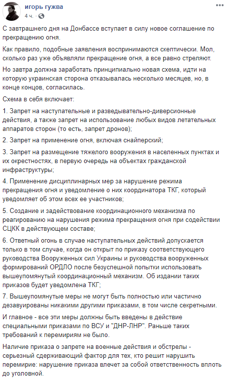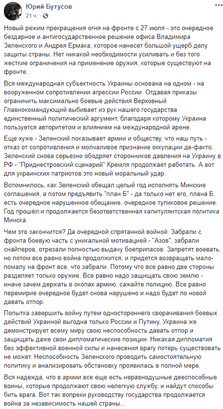 Главред сайта "Цензор" Юрий Бутусов пишет, что перемирие - "бездарное и антигосударственное решение офиса Владимира Зеленского и Андрея Ермака".