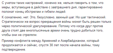 С учетом таких настроений, конечно же, нельзя говорить о том, что меры, вступающие в действие с завтрашнего дня, гарантированно положат конец обстрелам и гибели людей.