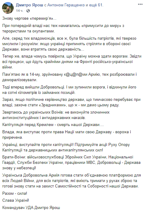 Бывший лидер "Правого сектора" Дмитрий Ярош призвал солдат не исполнять перемирие и призвал всех выходить на акции "Движения сопротивления капитуляции", которые, видимо, уже планируются.