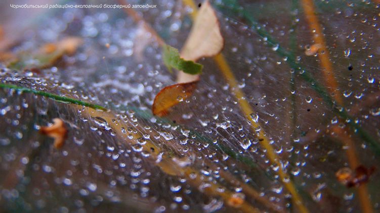 Сотрудники Чернобыльского радиационно-экологического биосферного заповедника опубликовали фото паутины, которая вместо насекомых поймала сухие листья и алмазные капли дождя.