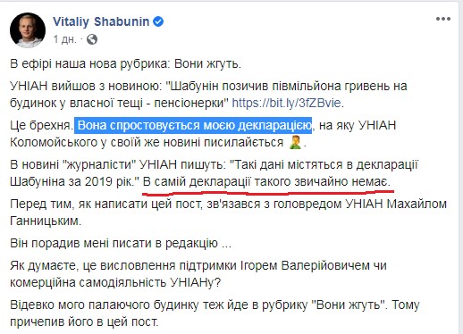 В новости "журналисты" УНИАН пишут: "Такие данные содержатся в декларации Шабунина за 2019 год." В самой декларации такого конечно нет.