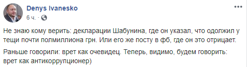 Журналист Денис Иванеско заметил, что после опровержения Шабунина даже не знает, кому верить - декларации, где он указал, что одолжил у тещи почти полмиллиона гривен или его же посту в Facebook, где он это отрицает.