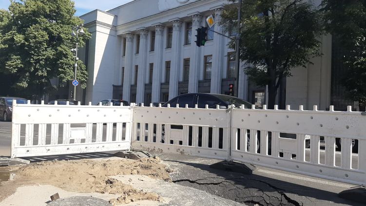 "Киевавтодор" сообщил о прорыве трубы на углу улиц Грушевского и Шелковичной, которая упирается в здание парламента. Из-за образовавшейся полости под покрытием, провалился асфальт.