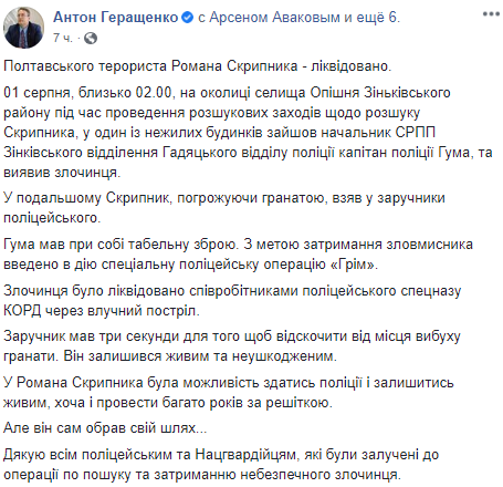 "Преступник был ликвидирован сотрудниками полицейского спецназа КОРД точным выстрелом. Заложник имел три секунды для того, чтобы отскочить от места взрыва гранаты. Он остался жив и невредим", - сообщил Геращенко.