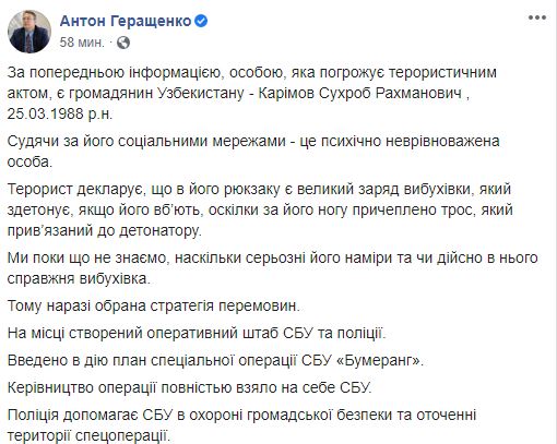 Первым личность террориста раскрыл замминистра МВД Антон Геращенко. Он назвал имя и дату рождения – Сухроб Рахматович Каримов, 1988 года рождения. По словам Геращенко, судя по соцсетям Каримова, он может быть психически неуравновешенным.