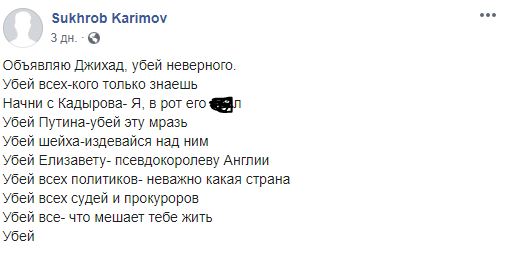 Например, он призывал к убийству Путина, Кадырова, руководства Израиля, английской королевы Елизаветы. Также Каримов объявил джихад.