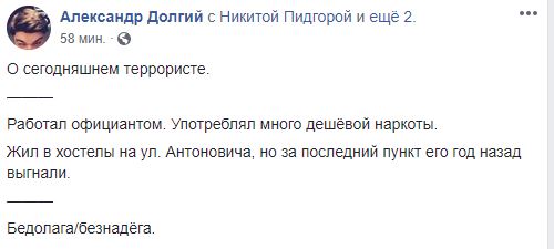 По данным блогера Александра Долгого, террорист некоторое время проживал в хостеле на улице Антоновича в Киеве, работал официантом. Употреблял амфетамин и марихуану, из-за чего лишился места в хостеле год назад.