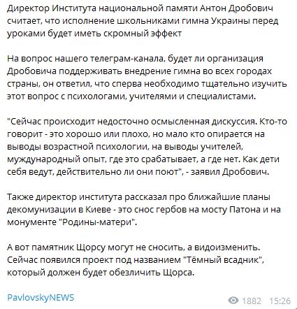 Директор Института национальной памяти Антон Дробович рассказал, что нужно делать с памятником Щорсу в Киеве. Также он заявил, что исполнение гимна школьниками по всей стране еще открытый вопрос и его нужно обсуждать со специалистами.