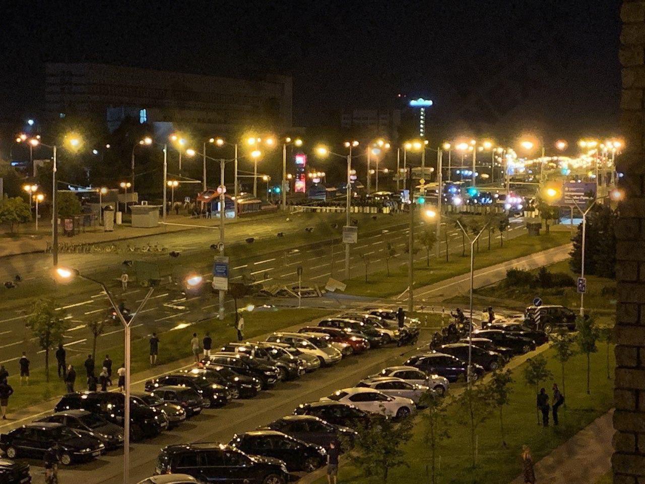 02:14 В сети публикуют видео с горящими шинами и коктейлями Молотова в центре Минска.