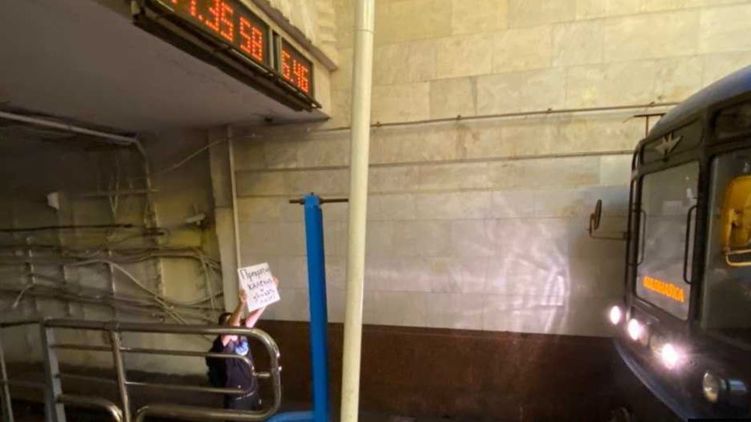"Прекратите калечить и убивать людей". В Минске мужчина с плакатом заблокировал работу метрополитена. Фото: Радио Свобода