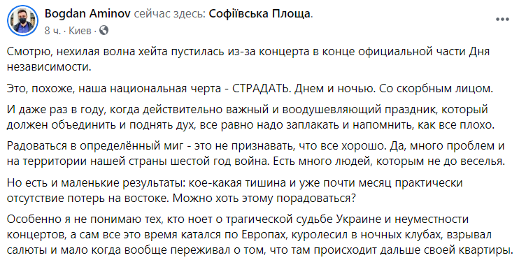 "Знаю, что многим не понравится мой комментарий, но я выступаю именно за такой современный формат празднования Дня независимости. Большой музыкальный номер из попурри украинских песен попал в самое сердце, ведь он показывает ценности, которые объединяют страну. Он играет на эмоциях миллионов к своей Родине и очень далек от традиционной политики с пафосными речами на трибуне и ненасытным грабежом за кулисами.