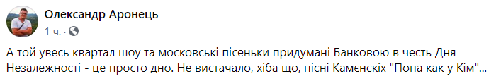 "Всё это квартал-шоу и московские песенки, придуманные Банковой в честь Дня Независимости - это просто дно. Не хватало разве что песни Каменских "Попа как у Ким", - возмущается свободовец Александр Аронец.