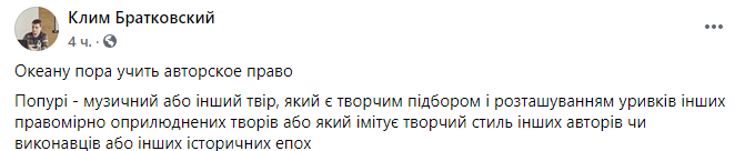 Попурі - музичний або інший твір, який є творчим підбором і розташуванням уривків інших правомірно оприлюднених творів або який імітує творчий стиль інших авторів чи виконавців або інших історичних епох", - цитирует законодательство Братковский.