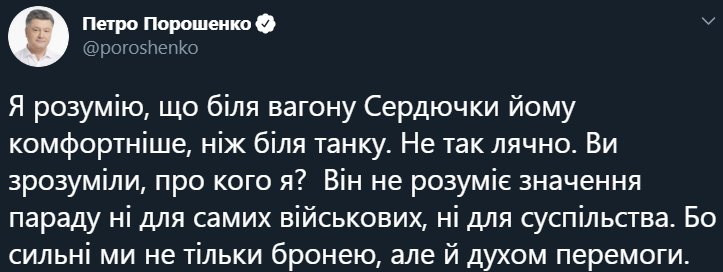 "Я понимаю, что у вагона Сердючки ему комфортнее, чем у танка. Не так страшно. Вы поняли, о ком я? Он не понимает значения парада ни для самих военных, ни для общества. Потому сильные мы не только броней, но и духом победы".